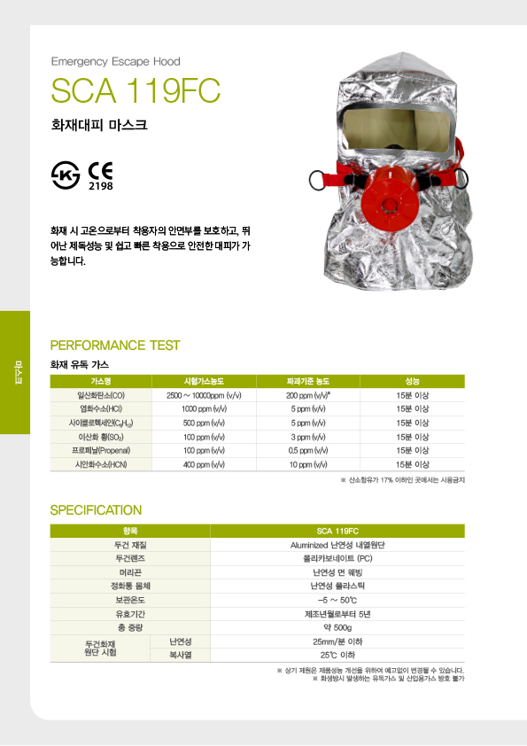 화재 시 고온으로부터 착용자의 안면부를 보호하고, 뛰어난 제독성능 및 쉽고 빠른 착용으로 안전한 대피가 가능합니다.