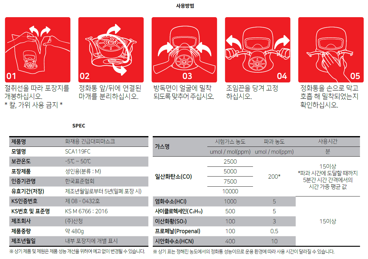화재 시 발생하는 유독가스와 일산화탄소 중독으로부터 착용자의 눈, 얼굴과 호흡구를 보호하는 마스크